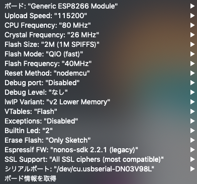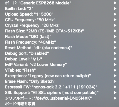 ESP8266を載せたArduino互換ボードです。スイッチサイエンスから販売されているESPr Developerを研究室ではよく利用するのですが、シリアルチップがFTDIチップであることと、8266のバージョンやArduinoのバージョンなんかでうまく動作しなかったり、書き込めなかったりするトラブルが頻発していたので、動作環境をまとめておきます。