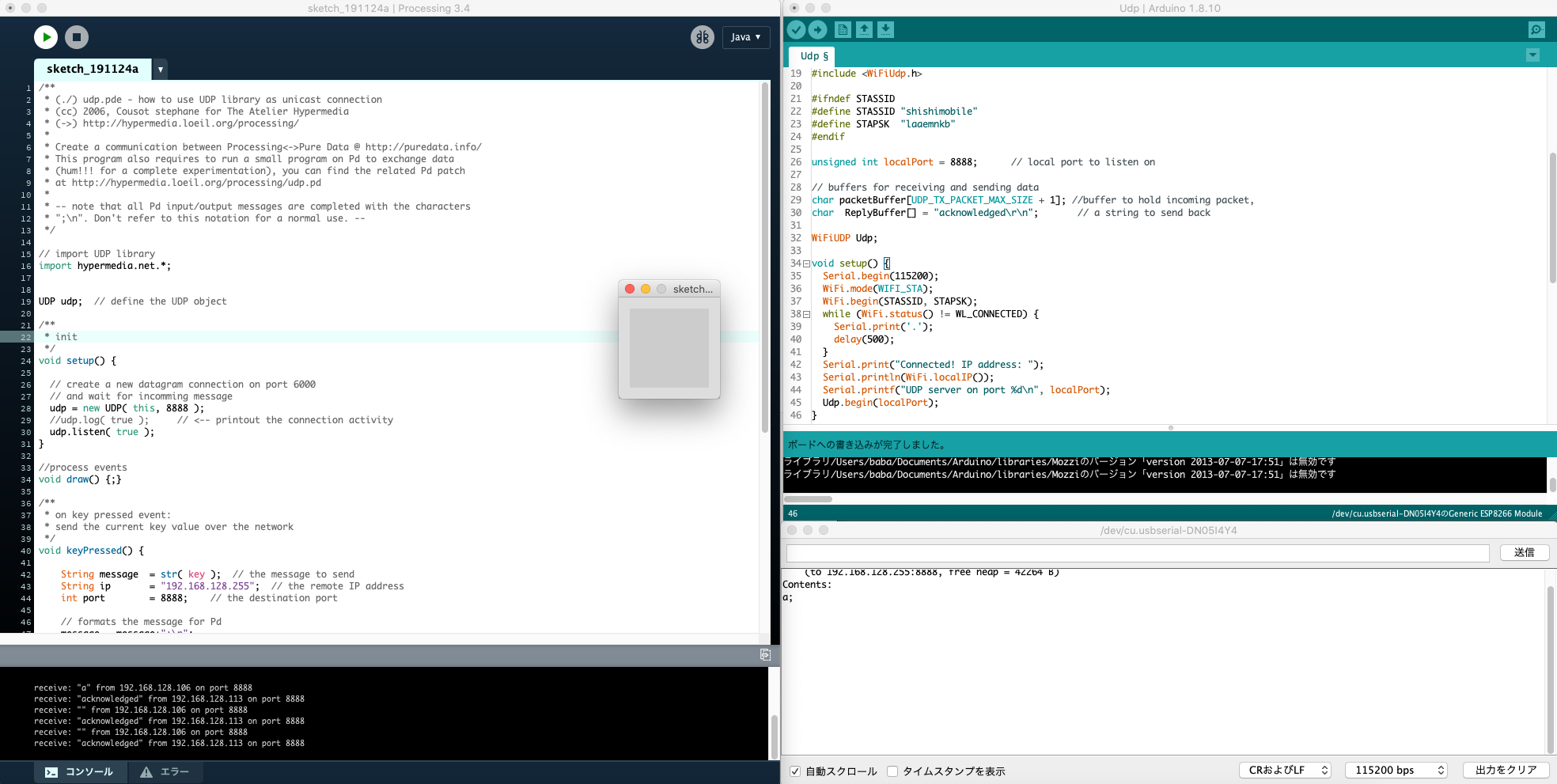 では実際に8266とPC上でProcessingを用いて記述したプログラミングの通信を行ってみます.8266のexampleとしては, ESP8266WiFiの中にあるUdpというサンプルを開き,SSID, Passwordを正しく設定してください.プログラムを書き込むと,シリアルモニタ上に 8266が接続した際のローカルIPアドレスが表示されるのでそれをメモしておきます.