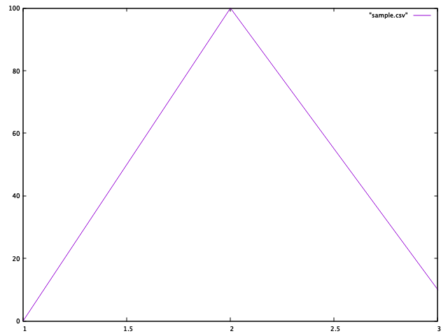 $ gnuplot $ gnuplot>set datafile separator "," $ gnuplot>plot "sample.csv" with lines $ gnuplot>q