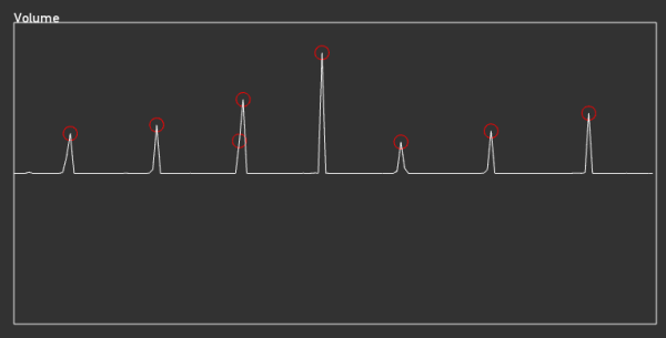 fftの平均パワーグラフを画面上に折れ線グラフで表示していますが、この値が一定値を超える、つまりしきい値を超えた場合にのみ、認識処理をしてみようと思います。そこで、まずはグラフを観察し、適切なしきい値を設定するために、ofxGuiを利用して動的に設定可能なしきい値パラメータを導入します。その値を超えているときだけ、 OFXGRAPH_POINT_LABEL_MARKERを利用して赤丸をプロットしてみます。下記に実際にしきい値を超えたときだけその点を赤丸で示した図を表示します。