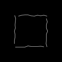 size(200, 200); background(0); stroke(255); strokeWeight(1); noFill(); beginShape(); for ( int i = 0; i < 100; i=i+10 ) { vertex(50+random(-3,3), 50+i); vertex(50+i, 150+random(-3,3)); vertex(150+random(-3,3), 150-i); vertex(150-i, 50+random(-3,3)); } endShape(CLOSE);
