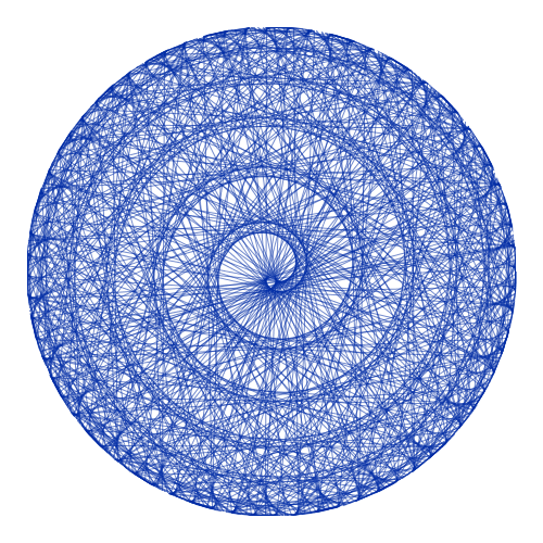 void setup() { size(500, 500); } void draw() { int step = 2; background(255); float r = 0.9*width/2; noFill(); stroke(24, 48, 151, 150); beginShape(LINES); int i, j; for ( i = 0, j = 0; i < 360; i=i+5, j=j+5*step ) { vertex(width/2 + r*cos(2*3.14*(i/360.0)), height/2 + r*sin(2*3.14*(i/360.0))); vertex(width/2 + r*cos(2*3.14*(j/360.0)), height/2 + r*sin(2*3.14*(j/360.0))); } endShape(CLOSE); } void keyPressed() { save("output.png"); }